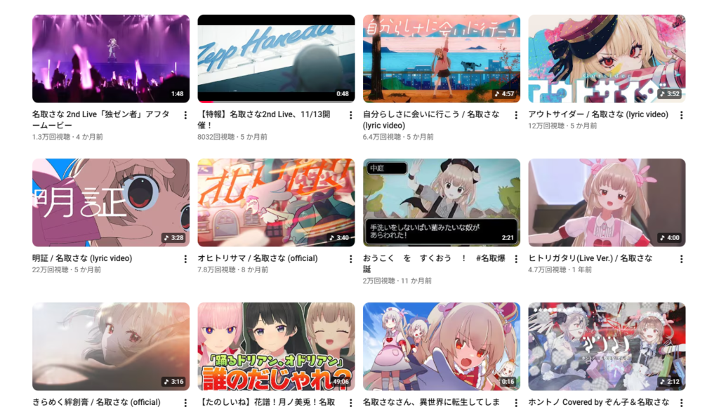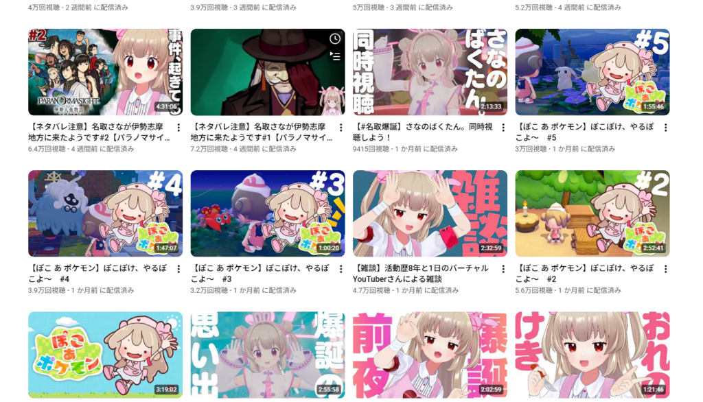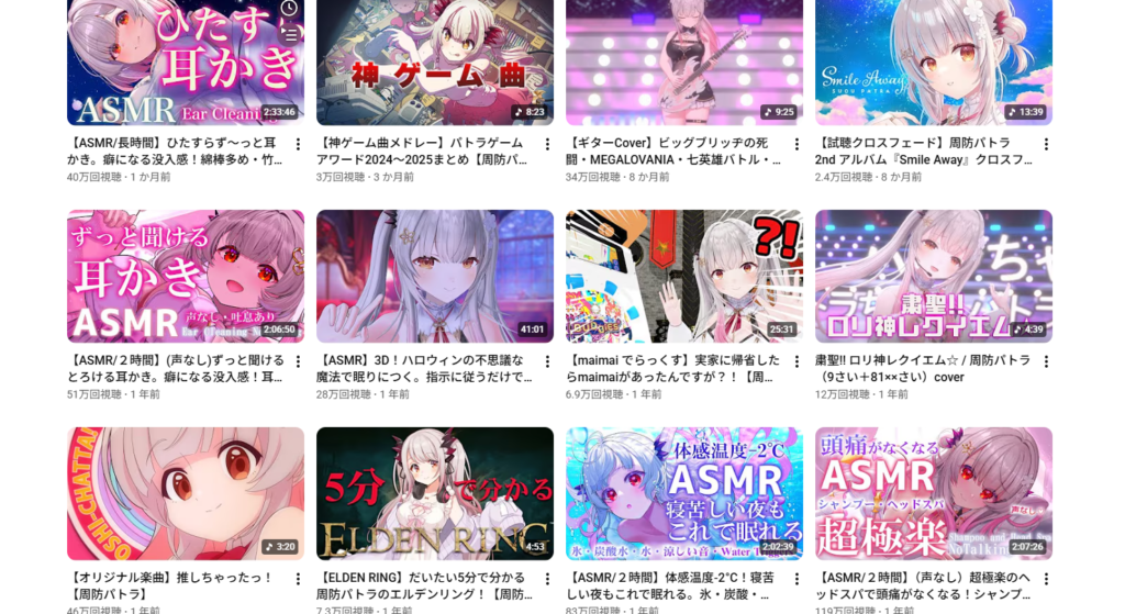 ✔ 以上をまとめるとVTuberがVSingerとして成功していきたい場合「❶チャンネルの動画一覧を歌系の動画で埋め尽くす形でVSingerであることをアピール」「❷ユニコーンカラーのホロライブ的アイドルV(的存在)になった上でVSingerとしての自分を主張していく」という二つのポイントをまず前提として押さえなければならない、ということになるのですが、それらを踏まえてチャンネルメイキングを行うと上の周防パトラ・名取さなの二例に近い形になります。〝普段の活動の軸は配信〟〝売りにしていることや本当にやっていきたいこと(=周防の場合はASMR、名取の場合は歌&ライブ)は動画チャンネルを埋める形で配置〟〝ほとんどが単体での活動で絡む相手は基本的に女性の活動者〟〝パッと見で分かるホロライブライクなアイドルタイプのV〟等が共通していて非常によく似た二人ですが、この二人と同じ型を作った上で動画一覧を歌動画で埋め尽くしていくとVSingerとして成功する可能性が出てくる……………と言うよりその挑戦をやっと始めることが出来ます。
