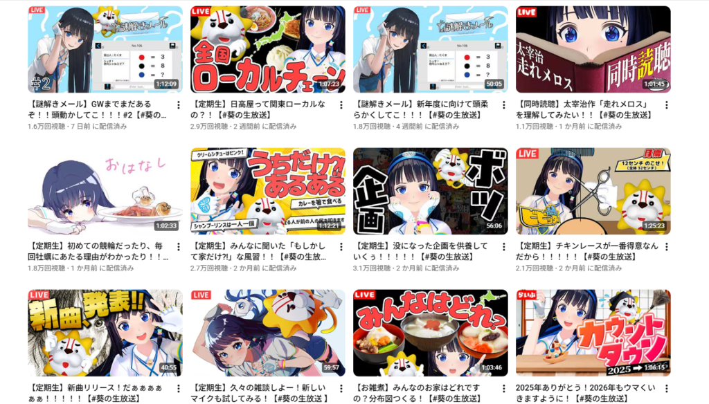 【③富士葵のチャンネル例(画像一枚目は配信一覧、二枚目は動画一覧)】