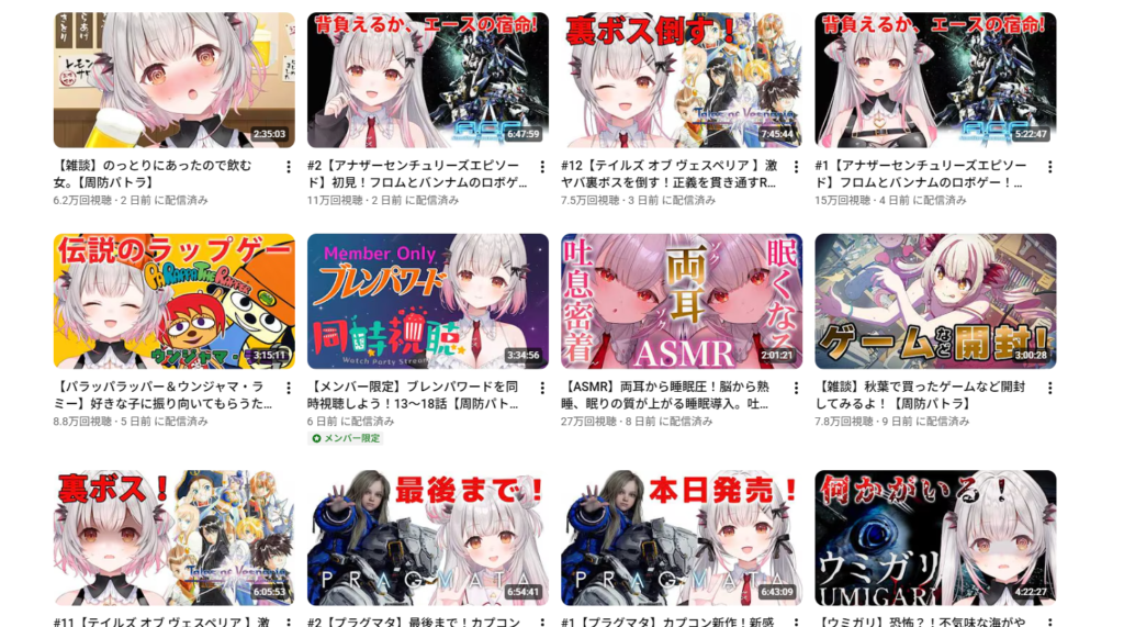 【①周防パトラのチャンネル例(画像一枚目は配信一覧、二枚目は動画一覧)】